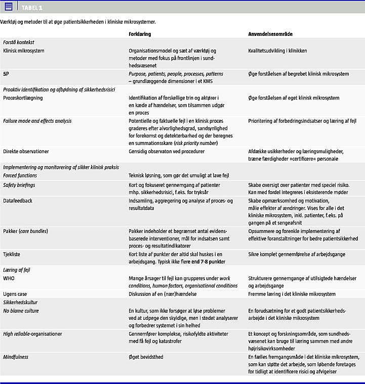 Sikre patientforløb skabes i og på tværs af KMS. Systematisk brug af metoder og værktøj til at opdage og fjerne risici og afledte skader er nødvendig for at gøre mikrosystemer sikrere for patienterne. Koncepter, metoder og værktøj opsummeres i Tabel 1. En proaktiv patientsikkerhedskultur i mikrosystemet bygger på holdninger samt kontinuerlig opmærksomhed og engagement hos ledere og klinikere.