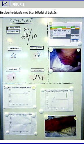 Her kan det hjælpe at drøfte hændelser, f.eks. i form af safety briefings, korte møder ved dagens begyndelse eller slutning, hvor sikkerhedsproblemer kan diskuteres, eller som et punkt om »ugens hændelse« på faste teammøder. Et team på en internmedicinsk afdeling har f.eks. en log for PVK-flebitis, hvor navn og formodet årsag noteres. Et andet team tager billeder af tryksår, som vises på den lokale datatavle (Figur 3 ). På disse teammøder skal lederne holde et konstruktivt fokus og fremhæve potentialet for læring. Ud over enkelte cases kan proces- og resultatdata bruges til at fremme læring i mikrosystemet [24]. Så tælles PVK med relevant og aktuel indikation, andelen af PVK, der fjernes inden 78 timer (procesindikatorer), og forekomst af flebitis (resultatindikator) i det ovennævnte mikrosystem [23]. Disse tal aggregeres og vises på en fælles tavle.