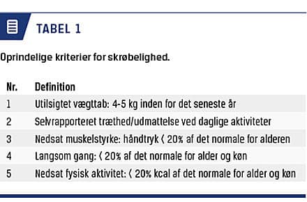 Der er beskrevet mere end 25 modeller, og der har været en del akademisk diskussion om, hvilke kliniske områder som skulle indgå i definitionen [1, 5, 11, 12]. En præcis afgrænsning er endnu ikke opnået, men på en international konsensuskonference om skrøbelighed i 2013 opfordredes man til at være mere aktiv for at identificere, diagnosticere og behandle syndromet, uanset hvilken model man anvendte (Tabel 2).