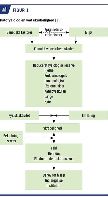 Fysiologisk opfattes skrøbelighed i dag som en uspecifik sårbarhedstilstand, der er udviklet over længere tid og afspejler ændringer i hele organismen (Figur 1). Syndromet er præget af mange målbare metaboliske forhold, hvor endokrine og immunologiske ændringer, oxidativt stress og neuronal aktivitet leder til celledød, organpåvirkninger og øget følsomhed for sygdom