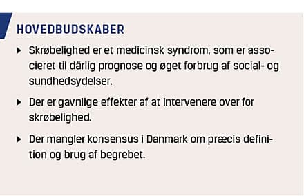 Der mangler konsensus om en præcis definition på begrebet skrøbelighed. Flere validerede værktøjer til identifikation, diagnosticering og monitorering er tilgængelige, men måleredskaberne er afprøvet på forskellige typer patienter og er ikke valideret i en dansk sammenhæng.