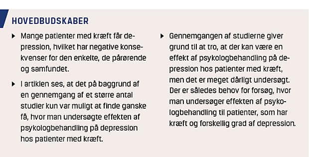 I de 37 gennemgåede artikler fra de seks Cochranereview [16, 21-25] viste det sig, at man ikke i nogen af studierne undersøgte psykologbehandling til patienter, der havde kræft og var inkluderet i studiet, fordi de havde en depression.