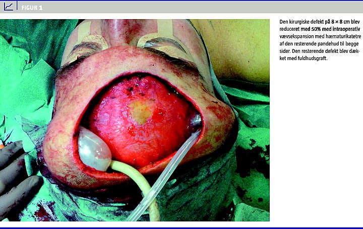 generende. Lægen vurderede, at den kliniske forandring var forenelig med et lipom og viderehenviste til en kirurg med henblik på ekscision. Kirurgen bemærkede atypisk hård vævskonsistens af præparatet og videresendte derfor til haste-mikroskopisk undersøgelse. De histopatologiske forandringer viste overraskende dermatofibrosarcoma protuberans (DFSP). Patienten blev viderehenvist til Plastikkirurgisk Afdeling, hvor der blev foretaget resektion (en bloc) tre cm omkring den primære defekt ned til periost. Svarende til periost var tumor usædvanlig adhærent i det tidligere resektionsområde. Tumorrande og periost svarende til tumorbund blev sendt til frysemikroskopi. Den histopatologiske undersøgelse viste frie resektionsrande fraset overgangen til periost, hvorfor der blev foretaget yderligere ekscision. Den kirurgiske defekt efter indgrebet målte 8 8 cm. Der blev foretaget tidlig rekonstruktion med supraperiostal underminering af den resterende pandehud til begge sider efterfulgt af intraoperativ vævsekspansion med hæmaturikatetre (Figur 1 ), hvilket kan mindske den kirurgiske defekt med op til 50%. Svarende til den resterende defekt blev der foretaget huddække med fuldhudsgraft på den blottede frontalknogle. Der er planlagt hyppig opfølgende kontrol hver tredje måned i de kommende tre år. Hvis der ikke herefter er tegn på recidiv af tumor, kan der foretages yderligere rekonstruktion med vævsekspansion og lokal advancement eller rotationslapper.