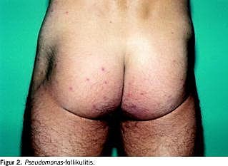 Ophold i opvarmede ikke sufficient rengjorte boblebassiner, spapooler eller ikke tilstrækkelig klorerede swimmingpooler kan resultere i, at hårfolliklerne koloniseres med Pseudomonas aeroginosa . I områder, hvor huden samtidig okkluderes af badedragten, kan der opstå egentlig infektion med papler og pustler (Figur 2 ). Diagnosen kan bekræftes ved podning. Forandringerne svinder sædvanligvis spontant, og antibiotisk behandling er sjældent indiceret. Rengøring herunder klorering af swimmingpooler og spapooler kan forebygge nogle udbrud.