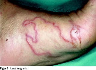 I subtropiske og tropiske lande kan hunde- og kattefækalier indeholde hageorm (Ancylostoma braziliense ). Under ophold på stranden kan huden typisk på fødder eller nates invaderes af disse kutane larver, og der fremkommer en lille papel, som hurtig efterfølges af en inflammeret, snoet og centimeterstor kanal (Figur 3 ). Diagnosen stilles på den karakteristiske klinik. Ubehandlet kan tilstanden fortsætte i måneder. Larven er dog ikke invasiv, og tilstanden heler spontant. Det anbefales at behandle med ivermectin, der gives peroralt som enkeltdosis. Alternativ behandling med frysning med flydende kvælstof foran læsionens progredierende forreste pol kræver øvelse. Vigtigste profylaktiske foranstaltning er konsekvent anvendelse af sandaler ved ophold ved stranden og altid at sørge for ikke at lægge sig direkte i strandsandet.