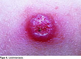 Kutan leishmaniasis forårsages af protozoer, som overføres fra gnavere via bid fra sandfluen Phlebotomos . Efter en inkubationstid på 2-8 uger fremkommer der en kløende papel, som hurtigt vokser til et inflammeret, kraterlignende nodulært, centralt ulcererende element med karakteristisk eleveret randzone (Figur 4 ). Der kan være flere elementer i en begrænset anatomisk region med flere indgangsporte. Diagnosen sikres ved histologisk undersøgelse. Behandling er en infektionmedicinsk opgave med natriumstibogluconat. Anvendelse af imprægneret myggenet og anvendelse af myggebalsam kan forebygge smitte.