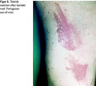 Under badning i troperne er der risiko for toksisk hudreaktion ved direkte kontakt med nældedyr, brandmænd og søanemoner. Speciel frygtet er berøring af tentakler fra goblen Portuguese war-of-man (Physalia psysalis ), som via intradermal injektion af toksinholdige nematodecyster fremkalder en umiddelbar brændende smerte og efterfølgende et stribeformet vesikobulløst udslæt (Figur 5 ). Tilstanden heler med hyper- eller hypopigmentering og behandles med potent kombinationskortikosteroidpræparat lokalt.