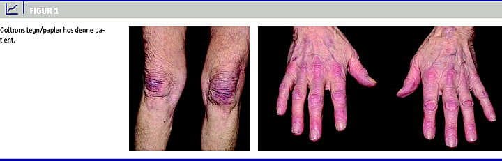Hudsymptomer ved DM er karakteristisk et rødviolet eksantem periorbitalt (heliotropt eksantem) med samtidigt periorbitalt ødem, rødviolet eksantem på hals og øvre bryst (V-tegnet), over skuldre, nakke og øvre ryg (sjaltegnet) samt lateralt over hofter og lår (pistolhylstertegnet). Hårbunden kan være afficeret. Ofte ses et violet erytem lokaliseret over MCP-, PIP-, DIP-, albue- og knæ-led (Gottrons tegn). Når udslættet er infiltreret og papuløst, anvendes betegnelsen Gottrons papler, som er patognomonisk for DM (Figur 1 ). Periungvalt findes ofte kapillaritis [2]. Der kan ses poikiloderma. Særligt hos børn kan der optræde subkutan calcinose. Hudstansebiopsi vil typisk vise dermalt ødem, mucinaflejring, lymfocytinfiltration, hyperkeratose og papillomatose. Histopatologien kan imitere kutan lupus erythematosus [3]. Myositkomponenten kan optræde før, samtidig med eller efter hudsymptomernes debut, og den manifesterer sig som symmetrisk kraftnedsættelse af den proksimale muskulatur. Myalgi er sjælden. Dysfagi kan ses ved affektion af den tværstribede muskulatur i pharynx og øsofagus [3]. Biokemisk kan der være forhøjede inflammationsparametre, herunder SR og specifikke autoantistoffer kan være positive. Myositis kan give forhøjet kreatinkinase, myoglobin og levertransaminaser. Myositspecifikke antistoffer kan være positive, men var ikke til stede hos aktuelle patient. Muskelbiopsi og elektromyografi (EMG) kan støtte diagnosen. Vores patient havde et klassisk tilfælde af DM, men ifølge de diagnostiske DM-kriterier, der er fremsat af Peter & Bohan i 1975 [4], opfyldte hun kun kriterierne for en sandsynlig DM, idet hun ikke fik foretaget muskelbiopsi eller EMG.