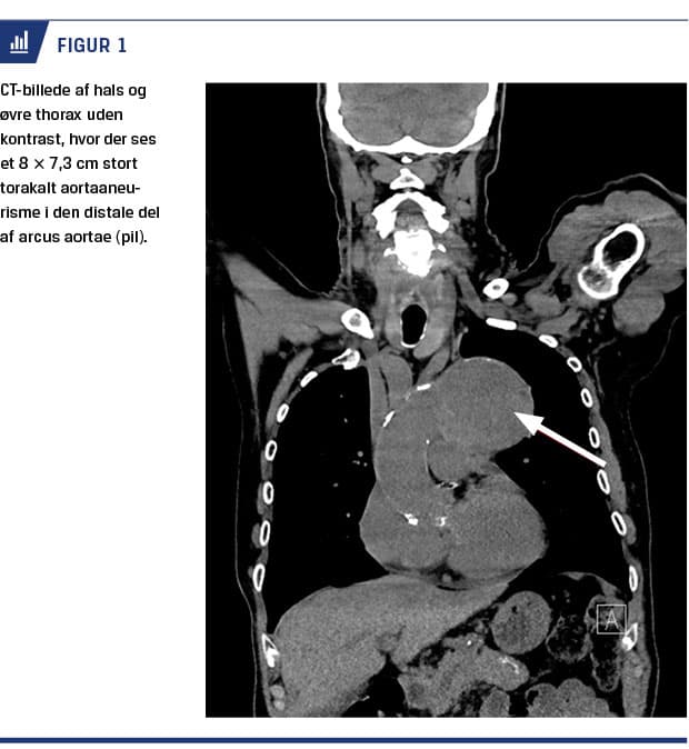 En 87-årig mand henvendte sig til en specialpraktiserende øre-næse-hals-læge pga. hæshed og intermitterende svigt af stemmen gennem to uger. Han havde ingen smerter, klumpfølelse i halsen, hoste eller åndenød. Patienten havde forhøjet blodtryk og var i medicinsk behandling for dette. Endvidere havde han været hospitalsindlagt for et rumperet infrarenalt aortaaneurisme og flere gange pga. akut myokardieinfarkt. Ved objektiv undersøgelse med fiberlaryngoskopi konstateredes venstresidig stemmebåndsparese, hvorfor han blev henvist til et lokalsygehus i kræftpakkeforløb under mistanke om cancer thyroidea. På den lokale øre-næse-hals-afdeling viste en ultralydundersøgelse af halsen en forstørret venstre lap af glandula thyroidea, men ingen afgrænset tumor. Der blev foretaget finnålsbiopsi, som gav mistanke om follikulær neoplasi, og patienten blev viderehenvist til en højtspecialiseret afdeling med henblik på operation. I overensstemmelse med retningslinjerne for pakkeforløb ved stemmebåndsparese blev der ud over objektiv undersøgelse, fiberskopi og ultralydskanning af halsen foretaget en CT af hals og øvre thorax. Skanningen viste normale forhold på halsen, men afslørede et 8 × 7,3 cm stort torakalt aortaaneurisme (Figur 1). Ved akut karkirurgisk tilsyn blev han vurderet at være inoperabel. Pga. begrænset mistanke om malignitet og fund af årsag til paresen blev der afstået fra hemityroidektomi, og patienten fortsatte i et kontrolforløb.