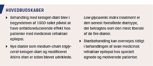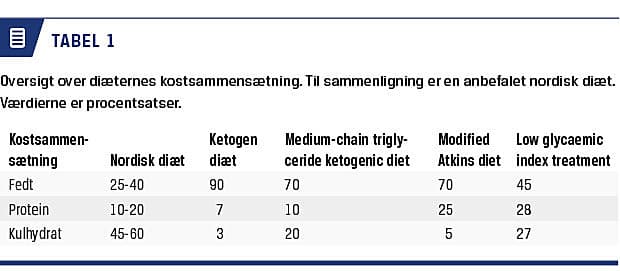 Epilepsi påvirker i dag 1% af den vestlige verdens befolkning og ca. 50.000 personer i Danmark. De fleste patienter kan behandles sufficient med antiepileptika, mens ca. 30% fortsat har recidiverende anfald og dermed har en medicinsk refraktær epilepsi [1]. Ketogen diæt (KD) bliver i dag særligt brugt til behandling af svær epilepsi hos børn. Der er ofte tale om svære epilepsisyndromer, der på trods af talrige forsøg med antiepileptika har et progredierende forløb og i værste fald fatale konsekvenser for patienterne. KD er baseret på en restriktiv kostsammensætning bestående af 90% fedt, 7% protein og 3% kulhydrat (Tabel 1). De metaboliske ændringer ved KD er en fastelignende tilstand i kroppen, hvor ketonstofferne acetone, beta-hydroxybutyrat (BHB) og acetoacetat dannes ud fra fedtsyrer fra den fedtholdige diæt. Ketonstofferne benyttes som primære brændstofsmolekyler i hjernens metabolisme i stedet for kulhydrater, der ikke længere er tilgængelige for metabolisme [2]. I begyndelsen af 1900-tallet blev diæt, eller nærmere vandfaste, foreslået af forskellige fysiologer heriblandt dr. Hugh Conklin til behandling af epilepsi. Dr. Conklin mente, at epileptiske anfald opstod som følge af et toksin, der blev produceret i tarmene. Faste i op til 25 dage ville få toksinet til at forsvinde. Dr. Conklins forsøg viste, at af de behandlede patienter blev 90% under ti år, 80% på 10-15 år, 65% på 15-25 år og 50% på 25-40 år »kureret« for deres epilepsisymptomer [3]. I 1921 udkom et studie af dr. Russel Wilder, der som den første kaldte diæten for ketogen diæt, idet han tillagde ketonstofferne en vigtig anfaldsreducerende rolle. Desuden påviste han, at ketose kunne opnås via en restriktiv kostsammensætning frem for en langvarig faste [3]. Udvikling og introduktion af nye antiepileptika betød, at KD fik minimal indflydelse på epilepsibehandlingen i de følgende årtier [4]. I 1970’erne kom der igen fokus på diætbehandling med nye tiltag som medium-chain triglyceride ketogenic diet (MCT-KD), modified Atkins diet (MAD) i 2003 og low glycaemic index treatment (LGIT) i 2005 [5]. I Tabel 1 vises diæternes kostsammensætning ift. en rekommanderet nordisk diæt [6, 7]. Det antages, at der i Danmark er under 100 patienter, der har epilepsi og p.t. er i diætbehandling. Behandlingen foregår på Odense Universitetshospital, Epilepsihospitalet Filadelfia og Rigshospitalet. I de seneste år er der kommet fokus på diætbehandling på andre områder, f.eks. ved psykiske lidelser, Parkinsons sygdom og specifikke cancerformer [8, 9]. Derudover er diætbehandling hos voksne med epilepsi også et aktuelt fokusområde.