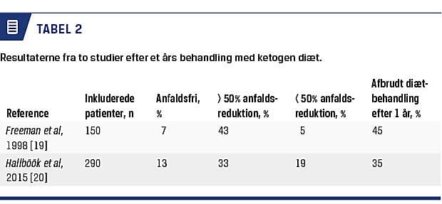 I adskillige studier har man dokumenteret en anfaldsreducerende effekt af hver af de fire diæter. Randomiserede kontrollerede forsøg (RCT) er dog underrepræsenteret, hvad angår KD, MAD samt KD-MCT, og mangler ved LGIT. Dette forringer den samlede kvalitet af evidens for behandlingseffekten. Ligeledes skal det nævnes, at en væsentlig begrænsning i diætbehandling er, at normalt fungerende teenagere og voksne patienter ofte oplever mindre effekt af behandlingen, end børn gør [15]. Tre nyere RCT’er viser samlet set, at 24,7-52% af børn, der var blevet behandlet med KD, MCT-KD eller MAD i tre måneder, havde over 50% anfaldsreduktion [16-18]. I Tabel 2 vises resultaterne fra to prospektive studier efter ét års behandling med KD [19, 20]. Et andet prospektivt studie af Beniczky et al viste, at 66% af de KD-behandlede patienter i studiepopulationen havde over 50% anfaldsreduktion efter tre måneders diætbehandling; 36% havde mere end 90% reduktion [21]. Sammenholdes resultaterne fra ovennævnte studier er der en større reduktion i anfaldsfrekvens efter tre måneder end efter ét år. En tendens til faldende effekt over tid ses ofte ved diætbehandling. Det anbefales, at KD udtrappes efter to år, da effekten i mange tilfælde da er aftagende. Dette vurderes altid individuelt i samarbejde med familien.