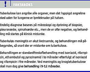 Summary Diagnosis of extrapulmonary tuberculosis is a challenge Ugeskr Læger 2011;173(12):886-889 In 2008 extrapulmonary tuberculosis accounted for 25% of the 367 cases of tuberculosis reported in Denmark. The majority of cases was seen in immigrants with 43% of the cases being extrapulmonary compared with 11% in ethnic Danes. Lymph nodes are most frequently affected followed by tuberculosis in pleura, bones and joints, the central nervous system, and the intraabdominal organs; but all organs can be affected. The treatment is standard therapy with four drugs for two months; in meningitis and pericaditis followed by at least four months with two drugs and corticosteroids.