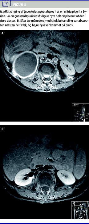 Den hyppigste form for tb i knogler og led er spondylitis tuberculosa (Potts sygdom) efterfulgt af artritis i de vægtbærende led og osteomyelitis uden for columna. Spondylitis tuberculosa sidder oftest i torakalcolumna. Infektionen begynder i den forreste del af corpus vertebra, hvorefter den breder sig til en discus intervertebralis og næste vertebra. Der kan udvikles abscesser paraspinalt eller som psoasabsces (Figur 1 ). Symptomerne begynder med lokaliserede smerter og almene symptomer, men der kan senere komme rodpåvirkning med lammelser til følge. Diagnosen stilles ofte på den kliniske mistanke kombineret med typiske forandringer, der kan ses på en magnetisk resonans (MR)-skanning, da det kan være vanskeligt at få materiale til mikroskopi og dyrkning [12].