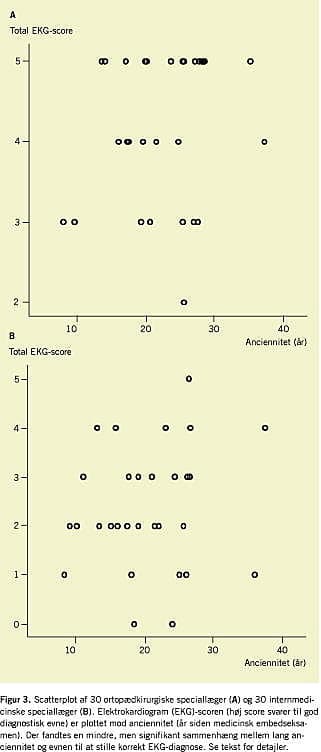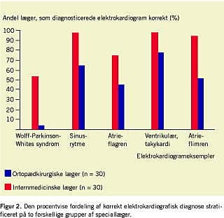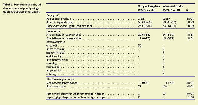 Resultater: De ortopædkirurgiske speciallæger var signifikant dårligere end de internmedicinske speciallæger til korrekt diagnosticering af EKG. Således var den mediane EKG-score for ortopædkirurgiske og internmedicinske læger henholdsvis to (spændvidde 0-5) og fire (2-5), og den summerede EKG-score var 71 og 124 (p < 0,01). Der var signifikant færre kvinder i den ortopædkirurgiske gruppe (to kvinder) sammenlignet med den interne medicinske gruppe (13 kvinder) (p < 0,01).