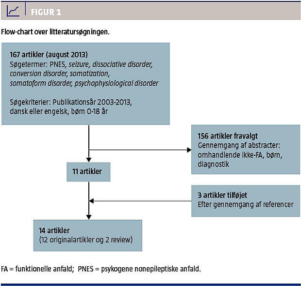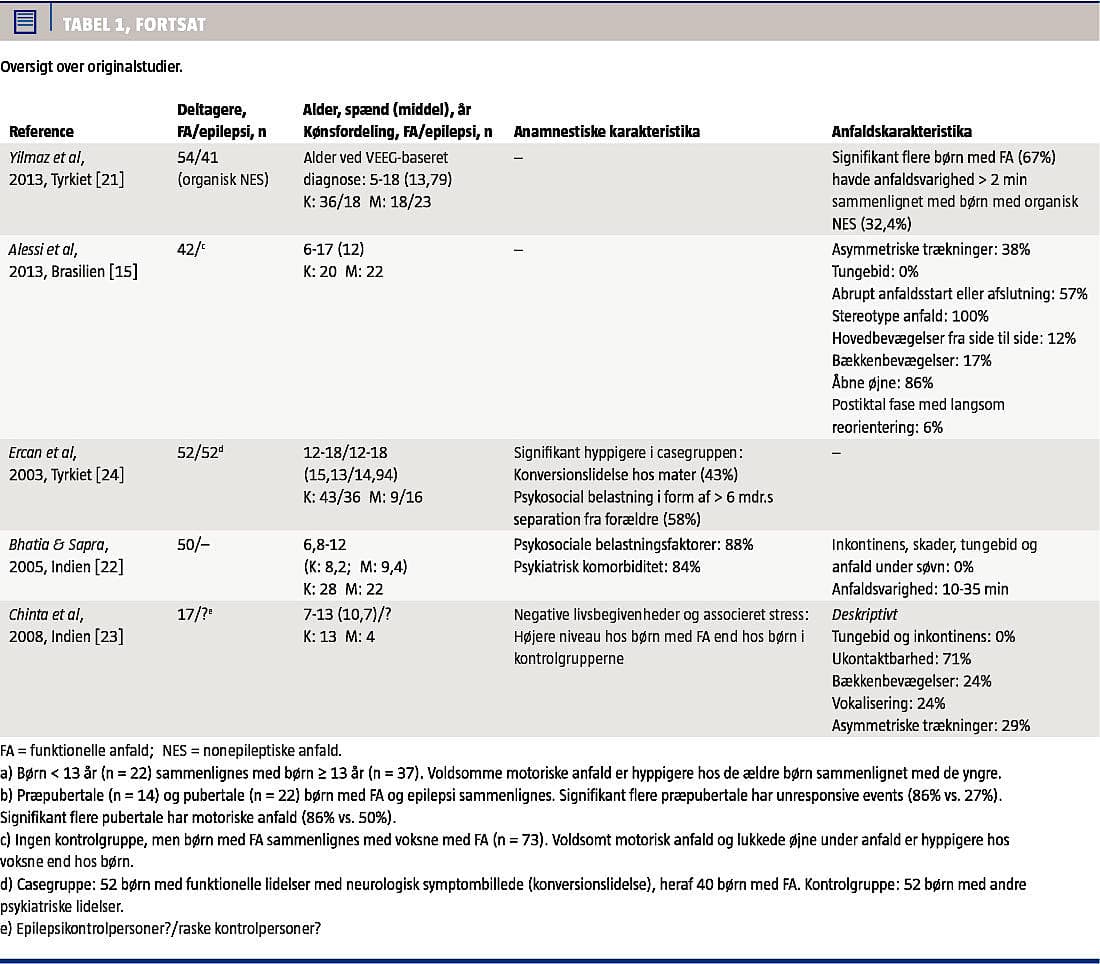 Den tilgængelige litteratur befinder sig på evidensniveau III-IV [14], idet der langt overvejende er tale om deskriptive studier og kasuistikker. Studierne er karakteriseret ved inklusion af små og ofte højt selekterede studiepopulationer og er oftest uden relevante kontrolgrupper (f.eks. børn med epilepsi) til sammenligning. I hovedparten af originalstudierne er der kun inkluderet børn med video-EEG-konfirmeret FA [5, 9, 15-21], men i enkelte studier er diagnosen baseret på mindre sikre kriterier [22-24]. Dataindsamlingen er hovedsageligt foregået retrospektivt ved f.eks. journalreview og uden brug af standardiserede redskaber/spørgeskemaer. Desuden inkluderede man i nogle af studierne børn med andre funktionelle (medicinsk uforklarede) symptomer end FA og børn med komorbid epilepsi.
