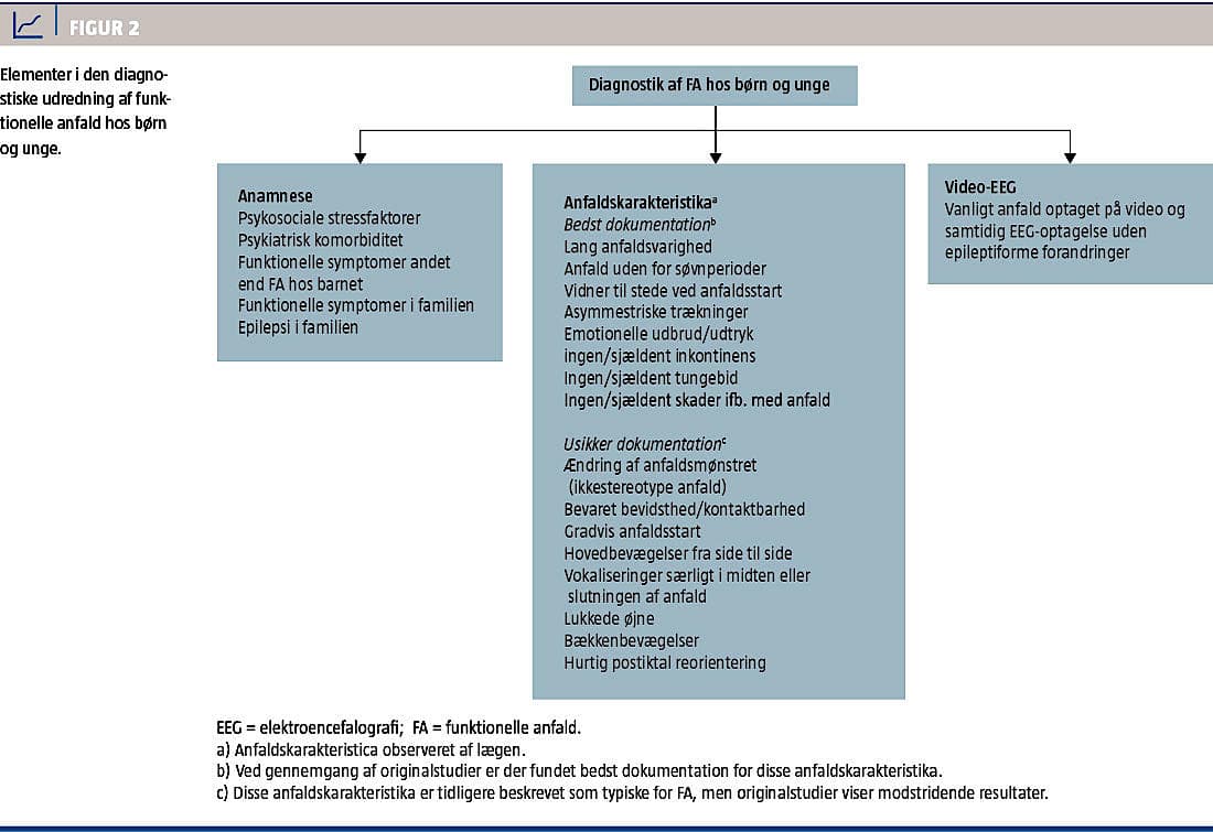 I de nuværende anbefalinger for den diagnostiske udredning betones det, at en samlet vurdering af en grundig anamnese i kombination med observation af et karakteristisk anfald på video-EEG er vigtig. En oversigt over diagnostikkens elementer, samt hvilke anamnestiske og anfaldsmæssige karakteristika der bør lægges særlig vægt på i differentieringen mellem FA og epilepsi, fremgår af Figur 2.