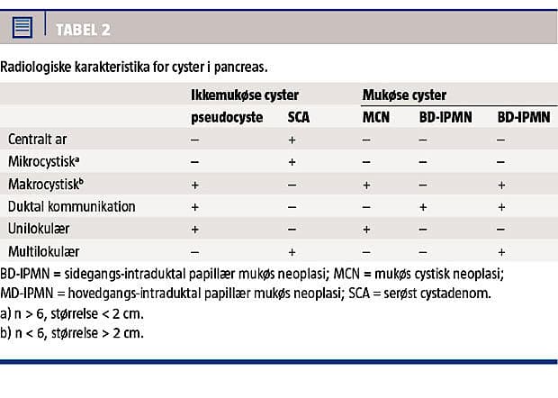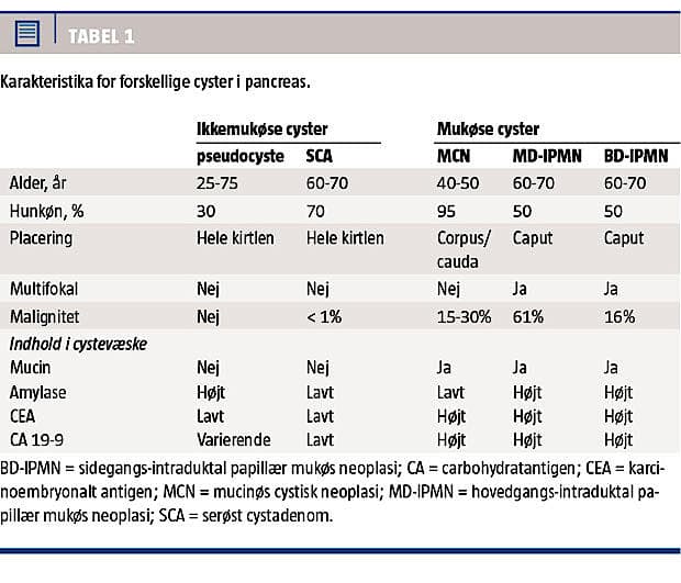 ikkeneoplastiske) [1]. De hyppigste neoplastiske PC omfatter serøst cystadenom (SCA), mukøs cystadenom (MCN) og intraduktal papillær mukøs neoplasi (IPMN) (Tabel 1).