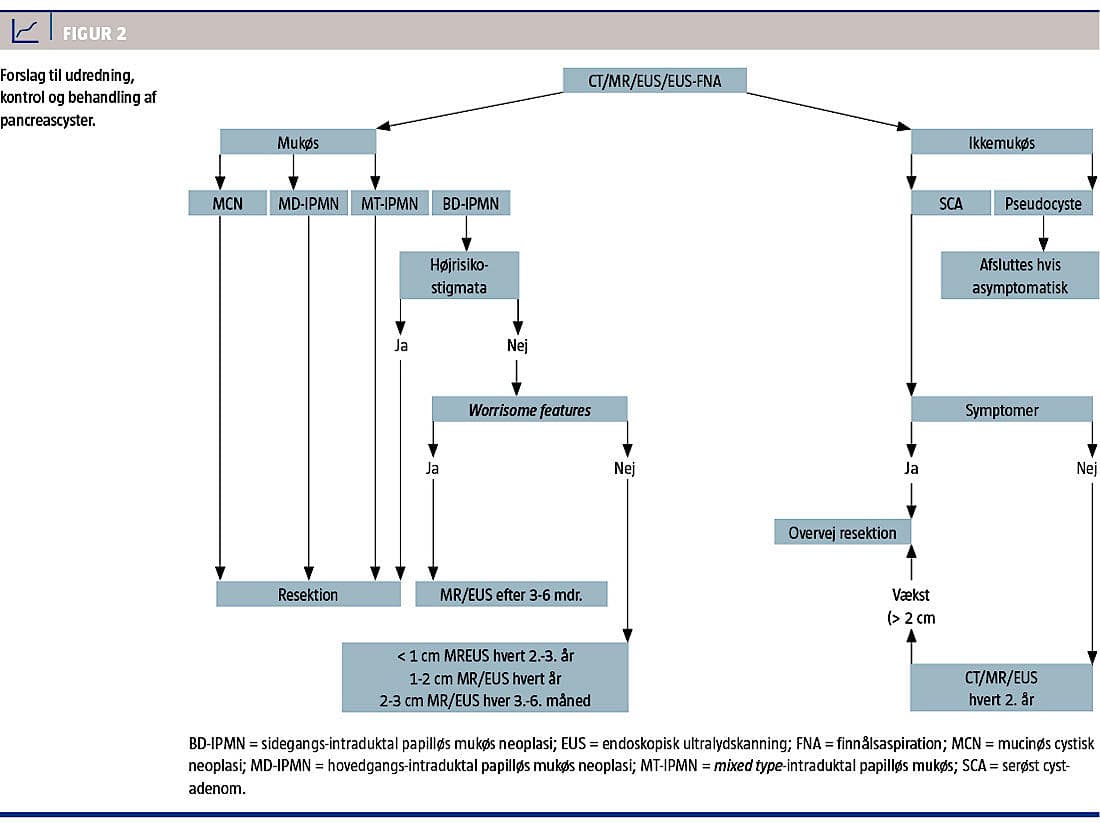 Patienter med MD-IPMN/mixed type-IPMN og MCN bør opereres, mens patienter med BD-IPMN vurderes med henblik på worrisome features og højrisikostigmata, hvoraf sidstnævnte også bør føre til resektion [9]. I relation til kontrol af BD-IPMN anbefaler man: 1) BD-IPMN < 1 cm bør kontrolleres med MR-skanning/CT hvert 2.-3. år for udvikling af worrisome features/højrisikostigmata, 2) BD-IPMN på 1-2 cm bør kontrolleres årligt, men ved uændret morfologi kan kontrolintervallet formentlig forlænges, og 3) BD-IPMN på 2-3 cm kontrolleres med EUS efter 3-6 måneder, herefter alternerende EUS/MR-skanninger