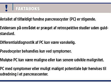 Pancreascyster (PC) defineres i henhold til de europæiske guidelines som: uni- eller multilokulær kavitetsformende neoplasme eller ikkeneoplastisk tumorlignende forandring i pancreas [1]. PC kan være associeret med andre cyster i kroppen, som f.eks. lever- og nyrecyster [2]. Incidensen og prævalensen af PC i Danmark er ukendt, men i et amerikansk studie angives en prævalens på 2,5% blandt de 40-84-årige [3]. I takt med den stigende anvendelse af CT/MR-skanning som led i udredningen af forskellige sygdomsgrupper stiger også antallet af tilfældigt fundne cyster i pancreas. I op mod 3% af alle CT’er er der PC som tilfældigt fund, mens det tilsvarende tal for MR-skanninger er 14% [4]. I 2013 blev der i Danmark udført ca. 475.000 CT’er og 107.000 MR-skanninger [5], hvor øvre abdomen kunne visualiseres, hvilket teoretisk set burde føre til påvisning af mere end 25.000 tilfældigt fundne PC.
