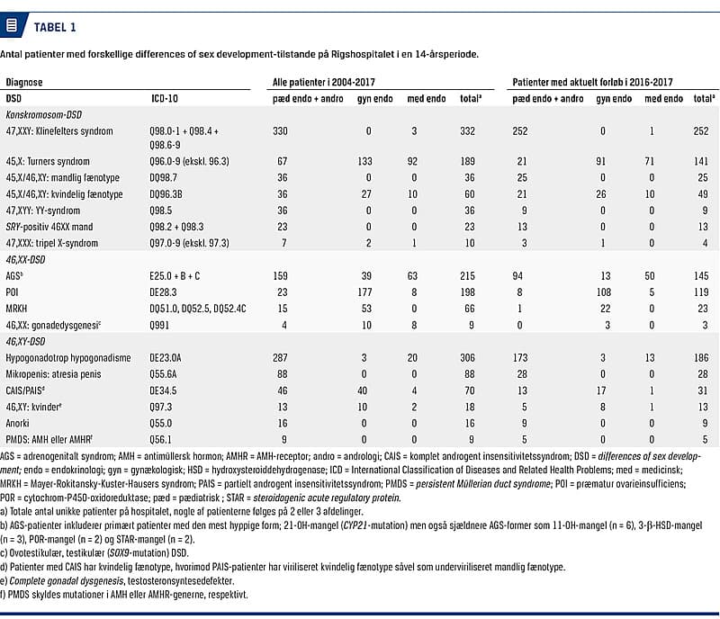 DSD har ikke en selvstændig ICD10-kode, men fungerer som en samlebetegnelse for mange forskellige og ofte sjældne tilstande, som heller ikke alle har selvstændig ICD10-kode og derfor ofte tildeles den ICD10-kode, som passer bedst. Man kan dog inddele og kode disse sjældne tilstande vha. Online Mendelian Inheritance in Man (OMIM) eller Orphanet-ID, hvilket imidlertid ikke registreres i Landspatientregistret. Det er derfor vanskeligt at få et samlet overblik over, hvor mange patienter med DSD der er i Danmark. Vi har for at anskueliggøre hyppigheden af de forskellige DSD-tilstande opgjort antallet af patienter på Rigshospitalet i en 14-årig periode (Tabel 1).