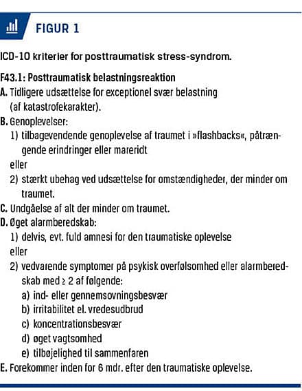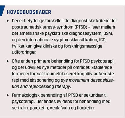 Et tiltagende antal patienter henvises i dag til psykiatrien under diagnosen posttraumatisk stress-syndrom (PTSD). Prævalensen af PTSD varierer i høj grad med diagnosesystem og måde at opgøre prævalensen på, men den anslås i en række europæiske lande til at være ca. 2% [1]. I risikogrupper som traumatiserede flygtninge, krigsveteraner og incestofre er prævalensen højere. Diagnosen har væsentlige individuelle og samfundsmæssige omkostninger og kan medføre svært nedsat funktionsniveau hos nogle patienter. Internationalt sker der i disse år en fornyet forståelse af diagnostikken af traumelidelser. Sideløbende sker der en udvikling af behandlingen af PTSD. Formålet med denne artikel er at beskrive den eksisterende psykopatologiske forståelse og evidensbaserede behandling af PTSD samt at introducere nogle af de ændringer, der sker inden for såvel diagnostik som behandling.