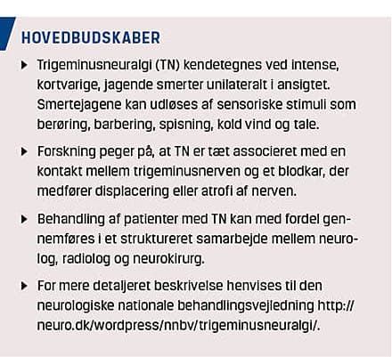 Trigeminal neuralgia (TN) is characterized by unilateral evoked short-lasting intense pain paroxysms in the face. A concomitant persistent background pain is frequently present. Neurovascular contact causing displacement or atrophy of the trigeminal nerve is important to TN aetiology. TN can also be secondary to a space-occupying lesion or multiple sclerosis. Early high-quality magnetic resonance imaging is mandatory as a part of the work-up. First-choice treatment is medical. Medically refractory patients are referred to neurosurgery. Nationwide in Denmark, there is a need for structured and uniform treatment of TN.