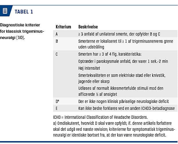 Da der ikke eksisterer nogen definitive diagnostiske test for TN, er anamnesen afgørende for at stille diagnosen. Det er vigtigt at afklare smertens varighed, lokalisation og kvalitet. Desuden skal det vurderes, hvorvidt et traume eller herpes zoster-udbrud i ansigtet var årsag til smertens debut, da både posttraumatiske og postherpetiske ansigtssmerter kan ligne TN-smerter. Det er også vigtigt at afklare, om smerten ledsages af udtalte autonome symptomer med henblik på at adskille TN fra sjældne primære hovedpinesygdomme. En anden differentialdiagnose er persisterende idiopatiske ansigtssmerter, tidligere kendt som atypiske ansigtssmerter, hvor smerten er primært konstant og murrende. Det er påvist, at patienter med denne lidelse kan adskilles fra patienter med TN ved anvendelse af de diagnostiske kriterier for TN [2, 9]. Da diagnosticering og behandling af TN kan være vanskelig, anbefales det, at alle patienter, hos hvem der er mistanke om TN, henvises til en neurolog.