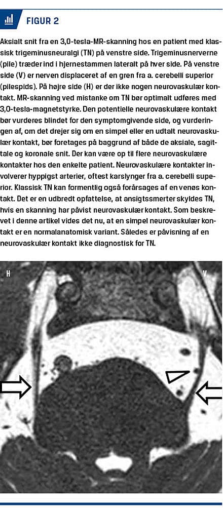 Det har længe været alment accepteret, at en kontakt mellem trigeminusnerven og et blodkar, en neurovaskulær kontakt, er involveret i ætiologien ved TN. Dette blev bekræftet i et nyligt publiceret studie, hvor man på den symptomgivende side fandt en neurovaskulær kontakt hos 89% af patienterne. Imidlertid havde 78% også en neurovaskulær kontakt på den symptomfrie side. Oddsratio for associationen mellem TN og neurovaskulær kontakt var 2,4. Den neurovaskulære kontakt blev i samme studie graderet således, at en kontakt, der medførte displacering eller atrofi af nerven, blev defineret som en udtalt kontakt (Figur 2), mens øvrige kontakter blev defineret som simple. En udtalt kontakt var til stede på den symptomgivende side hos 53% af patienterne og på den symptomfrie side hos 13%, hvorfor oddsratio for associationen mellem TN og en betydende kontakt var 11,6 [3]. Det konkluderedes, at en simpel neurovaskulær kontakt er en normalanatomisk variant og i sig selv ikke nødvendigvis fører til smerter, mens en udtalt neurovaskulær kontakt spiller en vigtig rolle ved TN. Der er utvivlsomt andre ukendte ætiologiske faktorer, der kan lede til TN som eksempelvis faktorer associeret med det kvindelige køn [4].