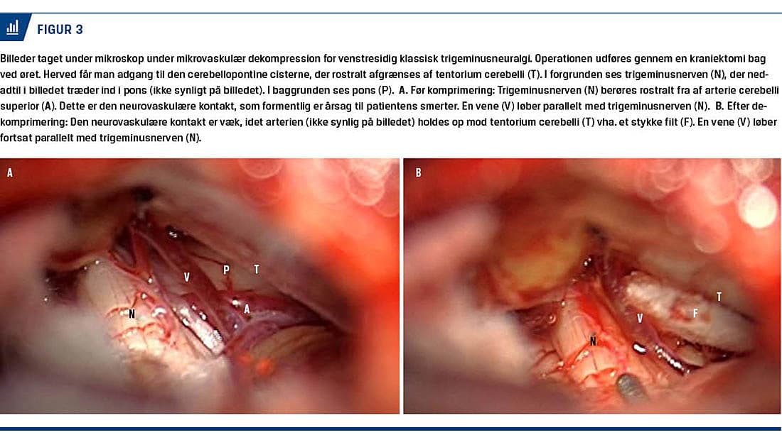 enten mikrovaskulær dekompression eller perkutane læsionsbehandlinger. Mikrovaskulær dekompression er førstevalg, hvis der er påvist en neurovaskulær kontakt. Operationen udføres under generel anæstesi gennem en 3 cm stor kraniektomi bag det ipsilaterale øre. Under mikroskop identificeres trigeminusnerven i den cerebellopontine cisterne, og tætliggende blodkar fridissekeres og enten flyttes ved at lime blodkarret fast til tentoriet eller adskilles fra nerven vha. et stykke filt (Figur 3).