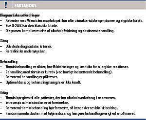 Samlet set må det konkluderes, at WE hyppigt overses ved klinisk undersøgelse, at tilstanden har stor morbiditet og mortalitet, og at behandlingen er atoksisk og lettilgængelig. Det er derfor i tråd med konklusionen i Damsgaard et al’s studie anbefalelsesværdigt, at man påbegynder højdosis i.v.-tiaminbehandling hos samtlige patienter med alkoholoverforbrug i anamnesen ved indlæggelse [7]. Ved klinisk mistanke om WE bør parenteral højdosistiaminbehandling fortsættes, så længe der ses klinisk bedring. En udvidelse af de diagnostiske kriterier og tilgængelige parakliniske undersøgelsesmetoder ville styrke diagnosen. Indtil der foreligger mere præcis evidensbaseret vejledning, må eventuel overbehandling være at foretrække frem for at risikere underbehandling, tilstandens alvorlige forløb taget i betragtning.
