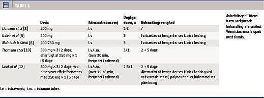 Den mest udbredte anbefaling af doseringsinterval er tre gange dagligt [3, 5, 6, 10, 12] pga. tiamins forholdsvis korte halveringstid på ca. 96 min [3, 5, 13]. Men med hensyn til dosis og behandlingsvarighed er det vanskeligere at finde entydige retningslinjer. Ved manifeste symptomer på WE anbefales døgndoser på 500-2.250 mg givet i.v. fordelt på 2-3 daglige doseringer [3, 5, 6, 10, 12]. Nogle steder anbefales det at behandle så længe, at der ses en bedring af symptomerne [5, 6, 12], hvorimod man andre steder anbefaler behandling i et bestemt antal dage Tabel 1 [10, 12]. De regionale fællesinstrukser for psykiatrien i Danmark giver ikke ensartede retningslinjer, men i alle regioner anbefales det at begynde med i.v.-behandling med døgndoser p å 800-1.600 mg. Behandlingslængden varierer mellem en og fem dage, og efterbehandlingen per os varierer mellem ti og 21 dage [14-16].