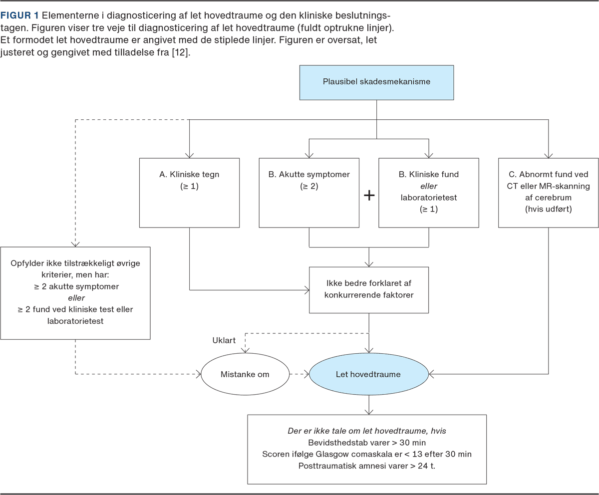 De hidtidige danske diagnostiske kriterier har taget udgangspunkt i kriterier udgivet af American Congress of Rehabilitation Medicine (ACRM) i 1993 [14]. Disse kriterier dannede udgangspunkt for kriterier foreslået af samtlige andre organisationer, herunder WHO’s fra 2004 [13]. Nu har ACRM udarbejdet nye diagnostiske kriterier [12] (Figur 1). Disse 1) udvider forståelsen af, hvad der opfattes som plausibel skadesmekanisme; 2) præciserer, hvad der menes med den akut påvirkede hjernefunktion; og 3) udvider muligheden for at diagnosticere let hovedtraume op til 72 t. efter hændelsen, hvis patienten ikke tilses af en læge med det samme. De nye kriterier kan anvendes på tværs af aldersgrupper og kontekster, dvs. i civilbefolkning, mht. sportsskader og i militær kontekst).