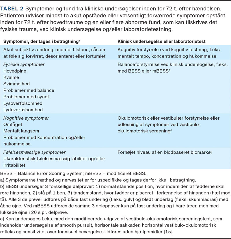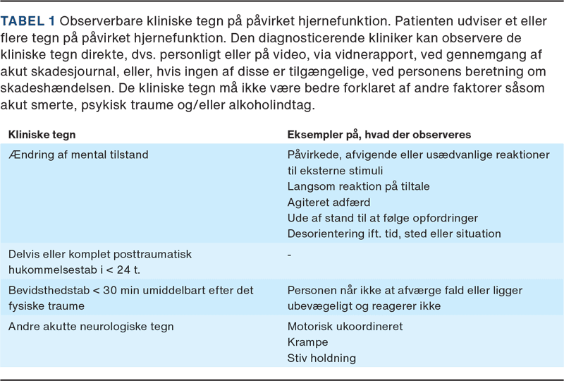 Har patienten været udsat for en plausibel skadesmekanisme, kan diagnosen let hovedtraume fastslås ved at vurdere enten 1) synlige kliniske tegn på den akut påvirkede hjernefunktion (min. ét tegn kræves), 2) oplevede symptomer og kliniske fund inden for 72 t. efter hændelsen (min. to symptomer og ét abnormt klinisk fund kræves) eller 3) billeddiagnostisk(e) fund svarende til let hovedtraume (Tabel 1).