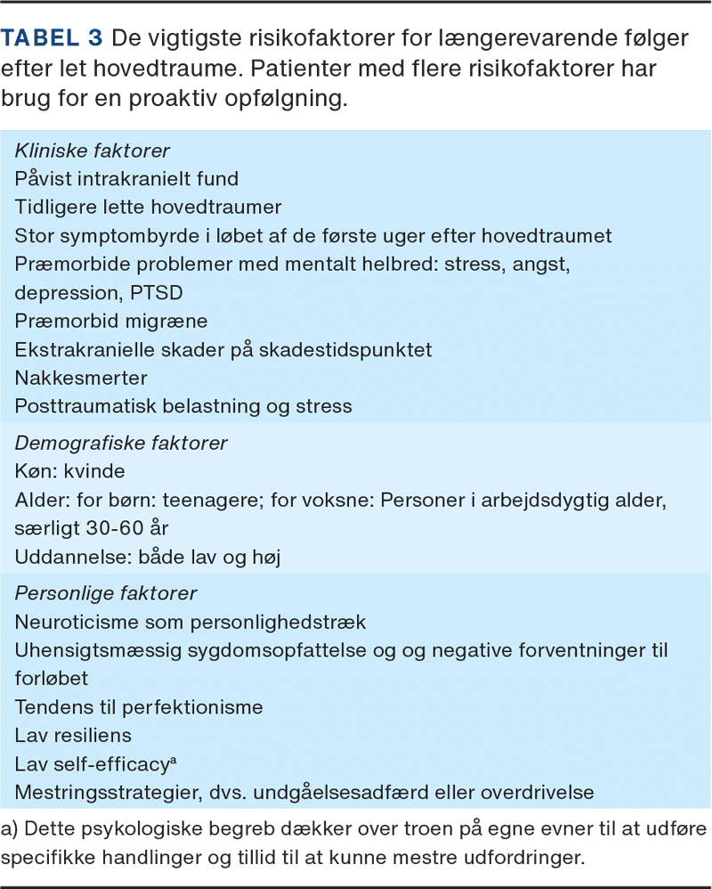Lægen skal i den individualiserede tilgang til patienten være opmærksom på eventuelle risikofaktorer (Tabel 3). Litteraturen understøtter, at jo flere risikofaktorer der er til stede, des større risiko er der for et længerevarende forløb. Der findes ikke en enkelt risikofaktor, der sikkert kan forudsige udviklingen. Mangel på bedring afspejler typisk flere forskellige faktorer [24]. De vigtigste faktorer lader til at være kvindeligt køn, alder og tidligere lette hovedtraumer [24]. Egentlige skadeskarakteristika lader til kun at spille en begrænset rolle i de tilfælde, hvor patienten får påvist en intrakraniel læsion på CT eller MR-skanning [25].