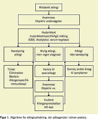 Allergiudredning i primærsektoren bør inkludere grundig anamnese, objektiv undersøgelse og laboratorieundersøgelse for IgE-sensibilisering (hudpriktest eller s-IgE-måling), som i langt de fleste tilfælde vil være tilstrækkelig for at stille en specifik diagnose. I modsat fald bør patienten henvises til en læge med specialkompetence i allergi, som kan sandsynliggøre sensibilisering og/eller klinisk følsomhed ved både kliniske og parakliniske test. Specialkompetence er særlig vigtig, når det mistænkte allergen ikke er standardiseret og/eller kommercielt tilgængeligt. Allergenprovokation er ofte nødvendig ved udredning af fødevare- eller lægemiddelallergi. Vi viser en algoritme for allergiudredning (Figur 1) og en oversigtstabel for dokumentation af allergologiske test (Tabel 1).