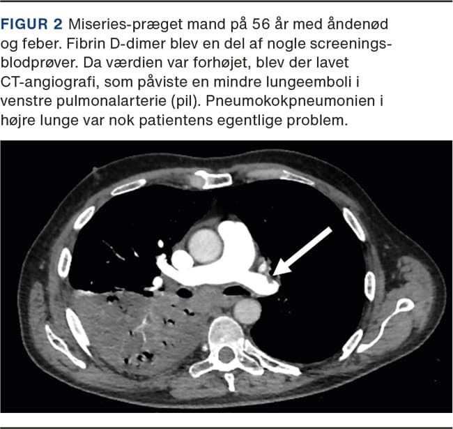 Den kliniske anvendelighed af D-dimer kompliceres dog af specificiteten, der ikke er tilsvarende høj og falder fra 67% hos de ≤ 40-årige til 10% hos patienter på ≥ 80 år, hvilket medfører en betydelig andel falsk positive. Således er antallet af D-dimer-målinger, det kræver at udelukke en lungeemboli (number needed to test) 3 i den gennemsnitlige akutmedicinske population og ≥ 10 hos patienter med cancer, infektion eller inflammatorisk sygdom [5, 7] (Figur 1). Dette afspejles i europæiske tal, hvor lungeemboli blot påvises hos ca. 20% af de patienter, der er henvist til CT-angiografi [8], og hvor en andel af embolierne er tilfældige og ikke kræver behandling, da de er små og sidder perifert [2].