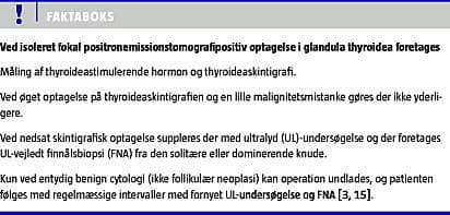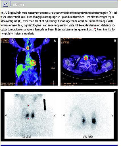 Knuder i glandula (gl.) thyroidea er hyppigt forekommende. I en dansk befolkningsundersøgelse fandt man ved ultralydundersøgelser, at 15% af de 40-45-årige kvinder havde multiple noduli i gl. thyroidea. Forekomsten steg med alderen til 25-30% af kvinderne i alderen 60-65 år. Studiet viste også, at 10% af de ældre kvinder havde en enkelt nodulus [1]. Et incidentalom i gl. thyroidea er en asymptomatisk nodulus, der er fundet tilfældigt ved billed- eller funktionsdiagnostisk undersøgelse af anden årsag. I takt med et øget forbrug af undersøgelser og den hyppige forekomst af noduli i gl. thyroidea påvises der flere incidentalomer end tidligere. Dermed er der en betydelig opgave med at selektere i denne patientgruppe, ikke mindst set i lyset af den lave incidens af thyroideacancer: 130-140 tilfælde årligt [2]. En funktionsdiagnostisk undersøgelse, der bruges i stigende omfang er positronemissionstomografi (PET), hvor 18 F-flurodeoxyglukose (18 F-FDG) er den mest anvendte radio-tracer . I onkologien anvendes PET sammen med diagnostisk computertomografi (CT) bl.a. til stadieinddeling samt kontrol af recidiv og behandlingsrespons. Fokal tracer -optagelse i gl. thyroidea ved FDG-PET-undersøgelse uden anden forudgående mistanke om metastaser i gl. thyroidea aftvinger yderligere diagnostisk afklaring.