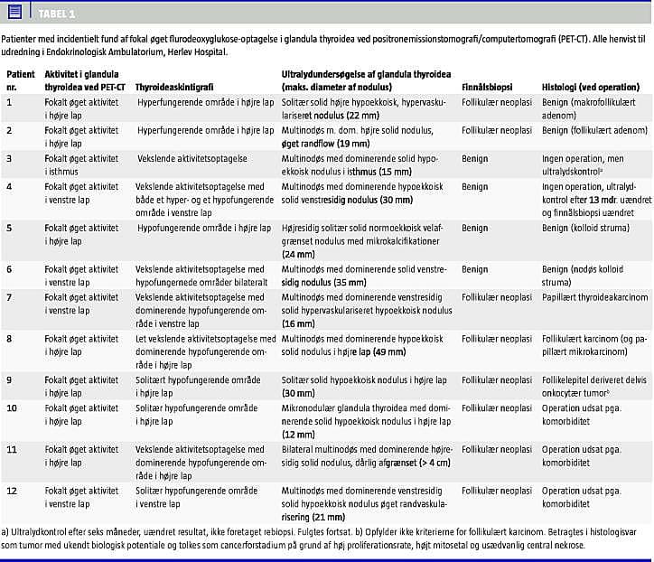 Usikkerhed om den diagnostiske sensitivitet og specificitet for øget FDG-optagelse i gl. thyroidea ved PET-CT afspejler sig i en endnu manglende konsensus om en omkostningseffektiv strategi for efterfølgende udredning. Dette illustreres ved gennemgang af konsekutivt henviste patienter til Endokrinologisk Ambulatorium, Herlev Hospital: Tolv patienter med tidligere cancersygdomme forskellig fra thyroideacancer fik foretaget PET-CT med incidentielt fund af fokalt øget aktivitet i gl. thyroidea (Tabel 1 ). Efterfølgende fik samtlige 12 patienter foretaget thyroideaskintigrafi og UL-undersøgelse. Fire patienter fik på skintigrafien påvist et hyperfungerende område og fik foretaget UL-vejledt FNA pga. en vis sonografisk suspicio. Alle fire havde enten benign cytologi eller benign histologi. I to af de fire tilfælde var cytologien forenelig med follikulær neoplasi, men histologien var benign. Dette fund støtter brugen af skintigrafi. Syv af 12 patienter fik foretaget diagnostisk thyroideakirurgi, men kun i to tilfælde fandt man ved operation malignitet i det på thyroideaskintigrafien påviste hypofungerende område. Hos en enkelt patient blev der ved histologisk undersøgelse påvist follikelepitelderiveret delvis onkocytær tumor med ukendt biologisk potentiale, og tilfældet blev betragtet som malignitetssuspekt. I tre tilfælde var patienterne så præget af deres primærcancer, at operation ikke var hensigtsmæssig trods et cytologisvar, der viste follikulær neoplasi. Dette understreger, at udredning af thyroideaincidentalomer bør afhænge af patientens generelle tilstand. De 12 patienter fik foretaget PET-CT i perioden fra den 8. januar 2009 til den 28. oktober 2010, og i den pågældende periode blev der gennemført 3.495 PET-CT'er på Herlev Hospital. To af de 12 patienter var henvist fra andre hospitaler, og de blev derfor udelukket i beregningen af hyppighed.