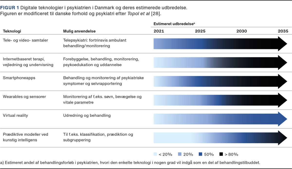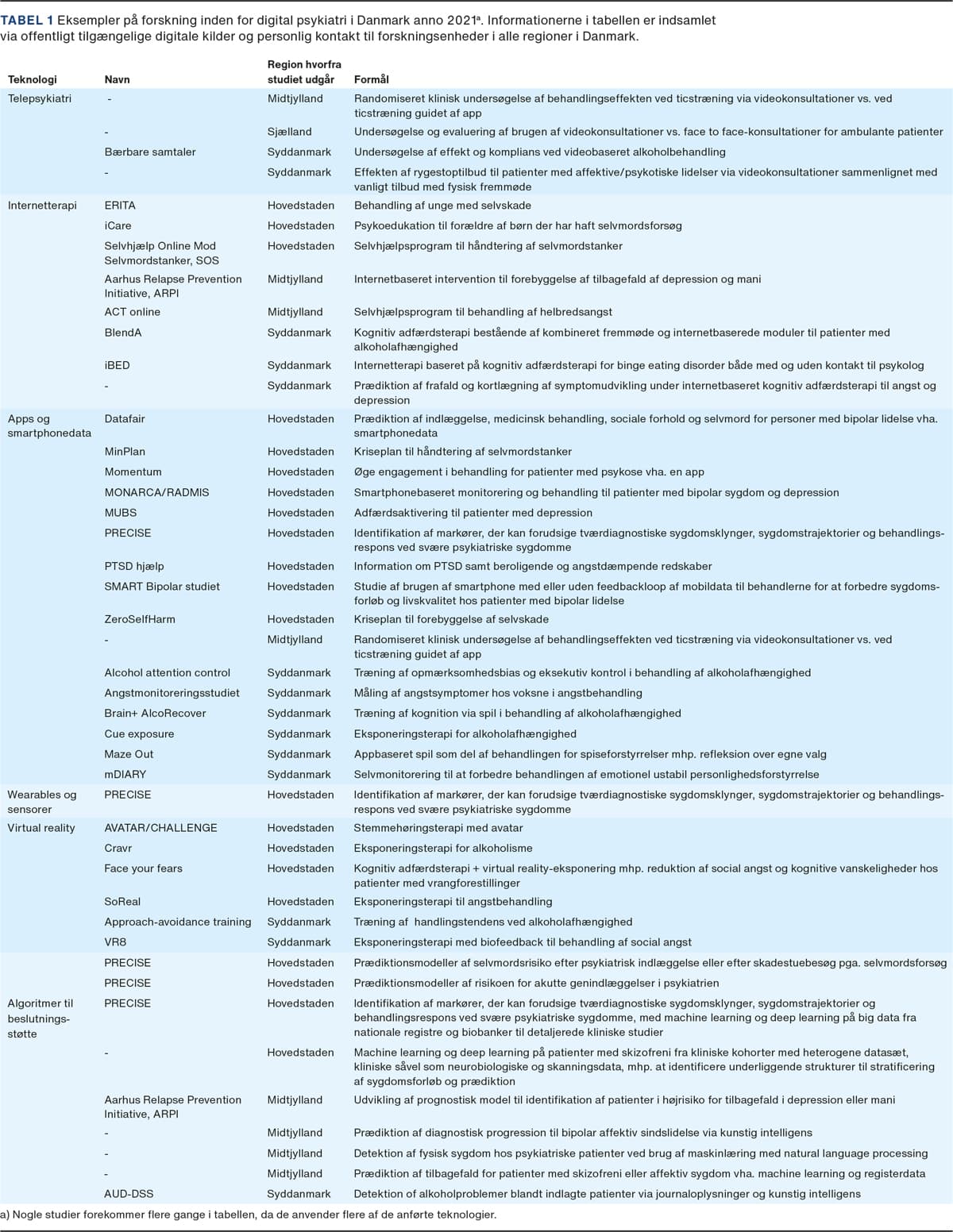 Danmark er et af de mest digitaliserede samfund i verden [1], hvilket sammen med de nationale registre giver unikke muligheder for at blive førende inden for digitale sundhedsløsninger. Teknologien kan bidrage med at kortlægge adfærd og reaktionsmønstre objektivt og minutiøst. Dette skaber særlige perspektiver for psykiatrien, hvor ændring af adfærd er en afgørende klinisk parameter, og hvor diagnostik og monitorering af behandlingseffekt traditionelt er baseret på lægens vurdering af patientens subjektive symptomer og fremtræden. Endvidere har COVID-19-pandemien vist, at samfundet og sundhedsvæsenet hurtigt kan omstilles til øget brug af digitale løsninger som for eksempel videokonsultationer [2].