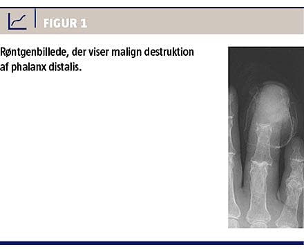 En 80-årig mand henvendte sig til egen læge med rødme og hævelse af yderste led på højre fjerde finger. Han havde ikke været udsat for et forudgående traume. Han klagede over lidt træthed, men var ellers i velbefindende. Han var eksryger og havde været eksponeret for asbest i sit tidligere erhverv. Egen læge havde mistanke om panaritium og påbegyndte behandling med dicloxacillin. Trods dette progredierede tilstanden med tiltagende smerter og spontan blødning fra fingeren. Patienten blev henvist til en ortopædkirurgisk afdeling, hvor et røntgenbillede viste total destruktion af phalanx distalis (Figur 1). Der blev foretaget kirurgisk revision, hvor man pga. udtalte forandringer valgte at amputere den distale del af fingeren. Den patologiske undersøgelse afslørede noget overraskende en udbredt ulceret malign tumor. Man vurderede, at det drejede sig om en metastase fra et lavtdifferentieret planocellulært karcinom formentlig udgået fra lungerne. Der blev foretaget CT af thorax/abdomen, og man fandt et 6 × 6 × 5 cm stort, venstresidigt, centralt lungekarcinom. Desuden sås en stor venstresidig pleuraansamling samt multiple satellittumorer og lymfeknudemetastaser kranialt for primærtumoren. Supplerende CT af cerebrum var uden tegn på metastasering. Patienten blev videreudredt med pleuracentese, som ikke afslørede maligne celler. Ved bronkoskopi derimod fandt man udtalte tumorforandringer i venstre overlapsbronkie. Forandringerne var spontant blødende, og man afstod fra biopsitagning og foretog i stedet bronkoalveolær lavage, hvorved mistanken om lungecancer blev bekræftet. Almentilstanden forværredes hurtigt, og i samråd med patienten blev det vurderet, at han ikke var kandidat til hverken onkologisk eller operativ behandling. Han afgik ved døden knap et halvt år efter den primære henvendelse hos egen læge.