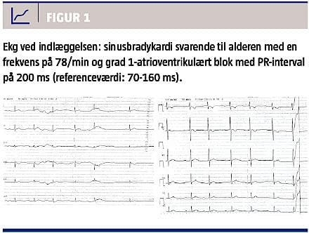Ved ankomsten var pigen stabil med hensyn til luftveje, åndedræt og cirkulation, hun klynkede, men der var fin kontakt. I tre døgn op til indlæggelsen havde hun haft flere opkastninger samt været bleg og klamtsvedende. Hun havde grædt mere og spist mindre. Et ekg viste sinusbradykardi for alderen med en frekvens på 78/min samt grad 1-atrioventrikulært (AV) blok med PR-interval på 200 ms (referenceinterval: 70-160 ms) (Figur 1). Blodprøver viste S-digoxinkoncentration på 7,2 nmol/l (referenceinterval: 1,0-2,6 nmol/l). Øvrige blodprøveundersøgelser inkl. af S-kaliumkoncentration viste normale forhold.