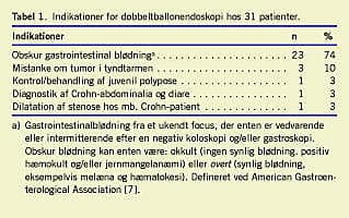 Enogtredive patienter (15 mænd og 16 kvinder, gennemsnitsalder 59 år, spændvidde: 15-88 år) fik i perioden fra marts 2004 til september 2006 fortaget en eller flere DBE på Gentofte Hospital. Indikationerne er angivet i Tabel 1. Den gennemsnitlige American Society of Anaesthesiology-score (ASA-score) for patientpopulationen var 2 (spændvidde: 1-3). Patienterne var gastroskoperet, koloskoperet og kapselendoskoperet forud for DBE og i øvrigt udredt med vanlige billeddiagnostiske undersøgelser. I gennemsnit havde hver enkelt patient fået fortaget fem billediagnostiske og/eller endoskopiske undersøgelser forud for DBE. Data til analyse blev indsamlet ved hjælp af journaler, stamafdelinger, praktiserende læger og telefoninterview.