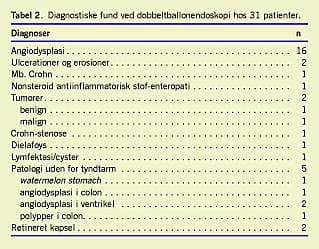 Materiale og metoder: Der blev foretaget en retrospektiv opgørelse over 31 patienter, der fra marts 2004 til september 2006 fik foretaget DBE på Gentofte Hospital. Indikationerne var obskur gastrointestinal blødning (n = 23), tyndtarmstumor (n = 3), abdominale smerter (n = 2), morbus Crohn (n = 1), juvenil polypose (n = 1) og tyndtarmsstenose (n = 1).