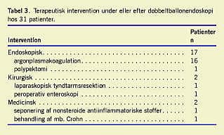 Resultater: Totalt blev der udført 42 DBE (32 oralt og ti analt). Intubationslængden for henholdsvis oral og anal DBE var 206 cm (spændvidde: 40-500 cm) efter Treitz' ligament og 141 cm (spændvidde: 10-200 cm) efter den ileokaekale overgang. Varighed henholdsvis 128 minutter og 124 minutter (spændvidde: 55-285 minutter og 60-155 minutter). To patienter fik fortaget endoskopi af hele tyndtarmen (panendoskopi). Det diagnostiske udbytte var 74% (konfidensinterval (KI): 57-86%). Hos 21 patienter (68%; KI: 50-81%) havde DBE en terapeutisk konsekvens. Der var en alvorlig komplikation i form af tarmperforation.
