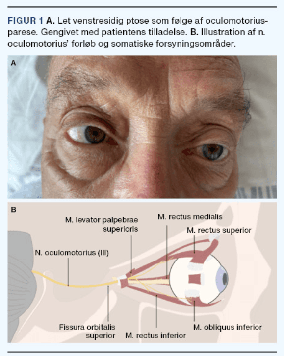 Ved neurologisk undersøgelse fandt man venstresidig ptose (Figur 1A). Gangen var let bredsporet, men der var i øvrigt ingen tegn på trunkal instabilitet eller ekstremitetsataksi. Ved oftalmologisk undersøgelse fandt man venstresidig nedsat adduktion, supraduktion og infraduktion samt diskret ptose, hvilket er foreneligt med en partiel oculomotoriusparese (Figur 1B). Blodprøver, herunder CRP og leukocyttal, var upåfaldende. CT af cerebrum med arteriel angiografi var normal.