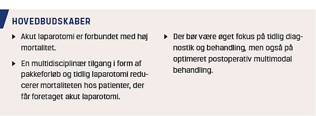 Flere studier tegner et billede af, at implementeringen af et care bundle for akutte laparotomier kan reducere mortaliteten. Der er behov for danske opgørelser og randomiserede studier, og fokus bør ligge på den perioperative optimering i form af pakkeforløb samt udvikling af selektionskriterier til DCS.