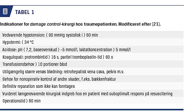 Der er endnu ikke veldefinerede kriterier for patientselektion og operative/perioperative behandlingsmål, men noget tyder på, at »den letale triade« i sig selv ikke kan benyttes. Derimod synes sepsis/septisk shock, forhøjet laktatniveau med acidose, alder, køn og komorbiditet at være relevante variabler [23].