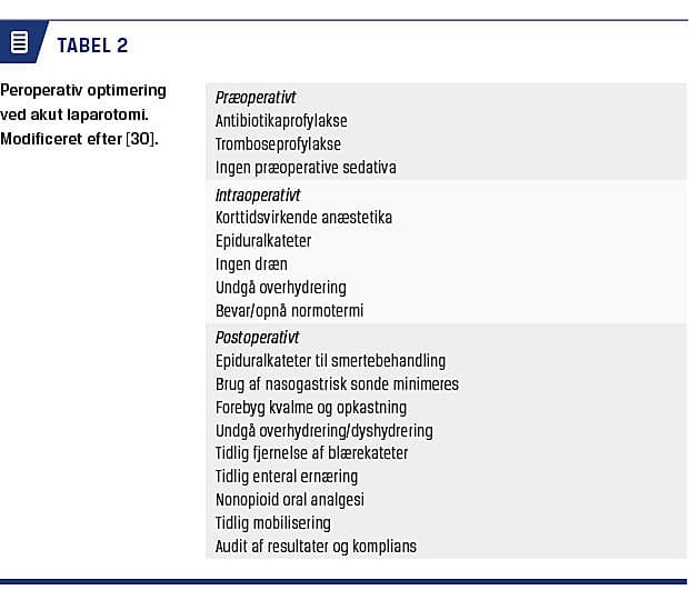 Der foreligger ingen evidens for det optimale perioperative forløb for patienter, der laparotomeres akut.