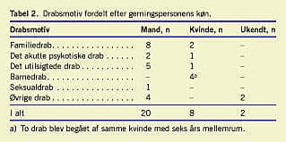 I to af de 30 drabssager var der tale om »komplette familiedrab«, hvor manden dræbte både børnene og hustruen og efterfølgende begik selvmord. Begge sager var uden kendt motiv. I et tilfælde dræbte en psykotisk kvinde to børn og forsøgte at dræbe ægtemanden og to øvrige børn, inden hun begik selvmord. Sagen blev klassificeret som et psykotisk drab. En samlet oversigt over drabsmotiver fordelt efter gerningsmandens køn fremgår af Tabel 2.