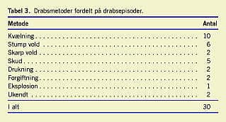 De anvendte drabsmetoder fremgår af Tabel 3. I ingen af de ni drabsepisoder, der omfatter flere ofre, blev der anvendt forskellige drabsmetoder. I fire drabsepisoder blev de dræbte udsat for forskellige former for overlast. I to sager var det primære traume henholdsvis skud på tæt hold og svær stump vold mod kraniet og det sekundære traume kulilteforgiftning og forbrænding. Ved to drabsepisoder medførte det primære traume bevidsthedsstab som følge af henholdsvis kværkning og forgiftning med bedøvende stoffer, og de sekundære momentant dødbringende traumer var overskæring af halspulsårerne og skud mod kraniet.